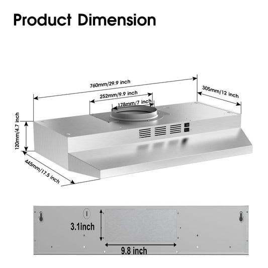 Range Hood 30 inch Under Cabinet, Stainless Steel Kitchen Vent Hood 280CFM, Built-in Kitchen Stove Hood w/Rocker Button Control, Ducted/Ductless Convertible Duct, 2 Speeds Fan, Bright LED Light