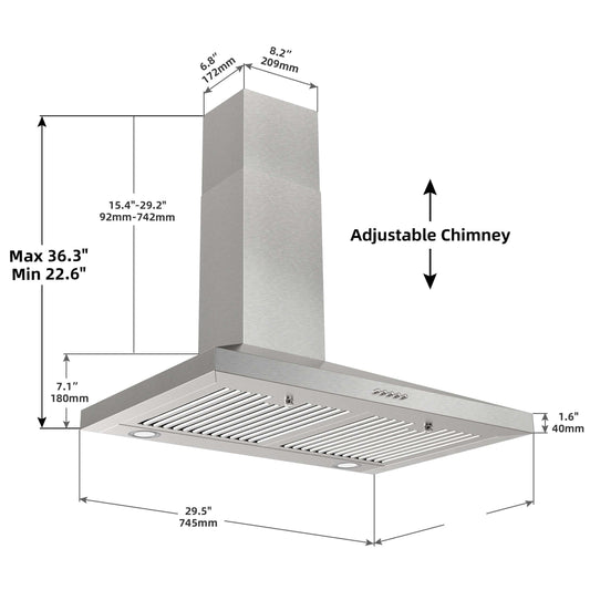 Hermitlux Range Hood 30 inch Stainless Steel, Wall Mount Vent Hood for Kitchen with Charcoal Filter, Ducted/Ductless Convertible