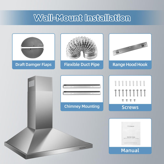 Zomagas 24 Inch Range Hood, Wall Mount Vent Hood in Stainless Steel with Ducted/Ductless Convertible Duct, 3 Speed Exhaust Fan, Energy Saving LED Light, Push Button Control, 2 Pcs Baffle Filters