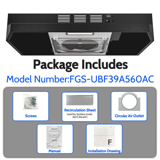 FIREGAS Black Range Hood 24 inch, 300CFM Ducted/Ductless Convertible Under Cabinet Kitchen Hood in Black Painted Stainless Steel with 2 watt LED Light and Filter, 2 fan speeds