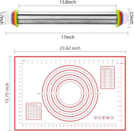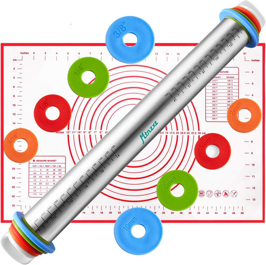 Stainless Steel Rolling Pin and Silicone Mat Set, Adjustable Thickness Rings - For Baking Dough, Pizza, Pies, Pastries, Pasta, Cookies