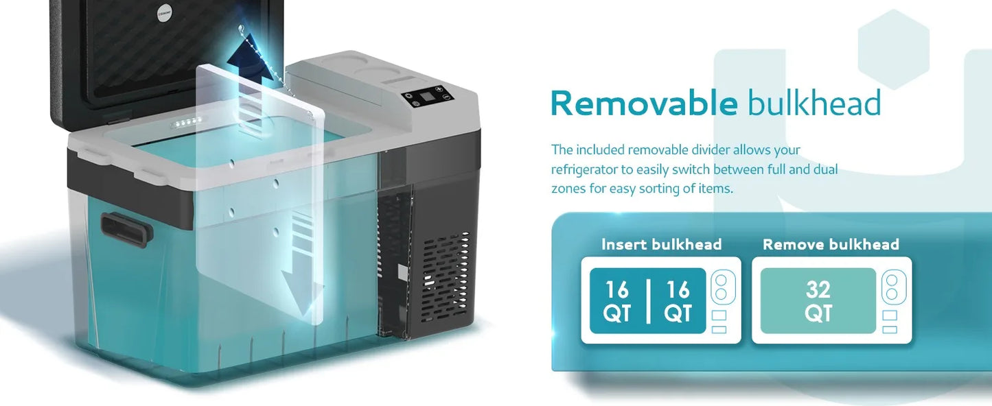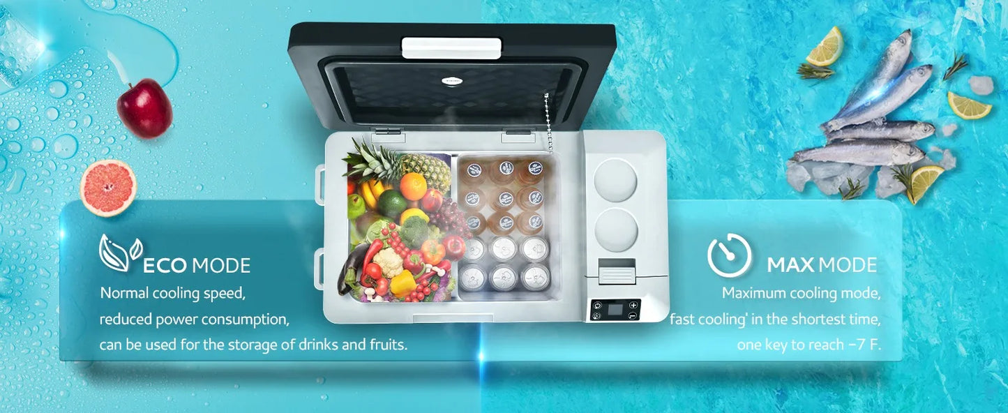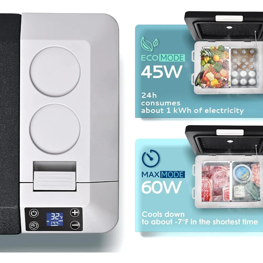 - ✲Cooling & Dual Mode✲ The car cooler adopts compressor refrigeration technology, this portable refrigerator can achieve rapid cooling from 50℉ to 32℉ within 15 minutes; the car fridge also includes a removable divider to separate the two zones , with ECO energy saving mode, this rv refrigerator only works at 45W. Even in MAX mode, the consumption of its smart loop work is only about 1kwh/day.