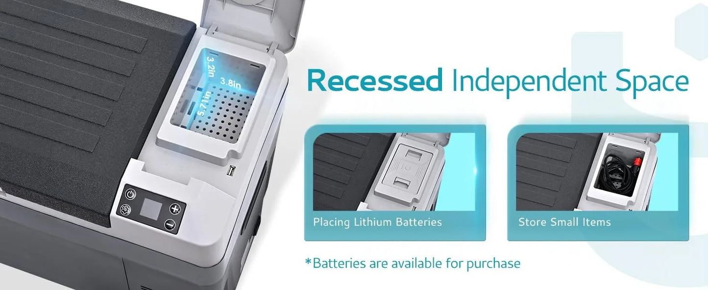 - ✲Independent space✲ Our electric cooler has a unique small space, if you buy a battery, it can be used as a battery power/charging compartment (the battery can last for 6 hours after being fully charged); if you do not need the battery of the 12v refrigerator, this small space can also be used as a multi- Functional storage box to store small objects such as power cords and small wrenches to avoid loss of items.