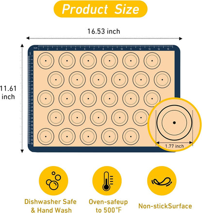 - [Premium Baking Essential]: Marked Silicone macaron baking mat measures 16.5×11.6 inches (Length×Width), ensuring non-stick precision and easy cleanup for professional dessert results.