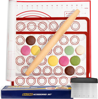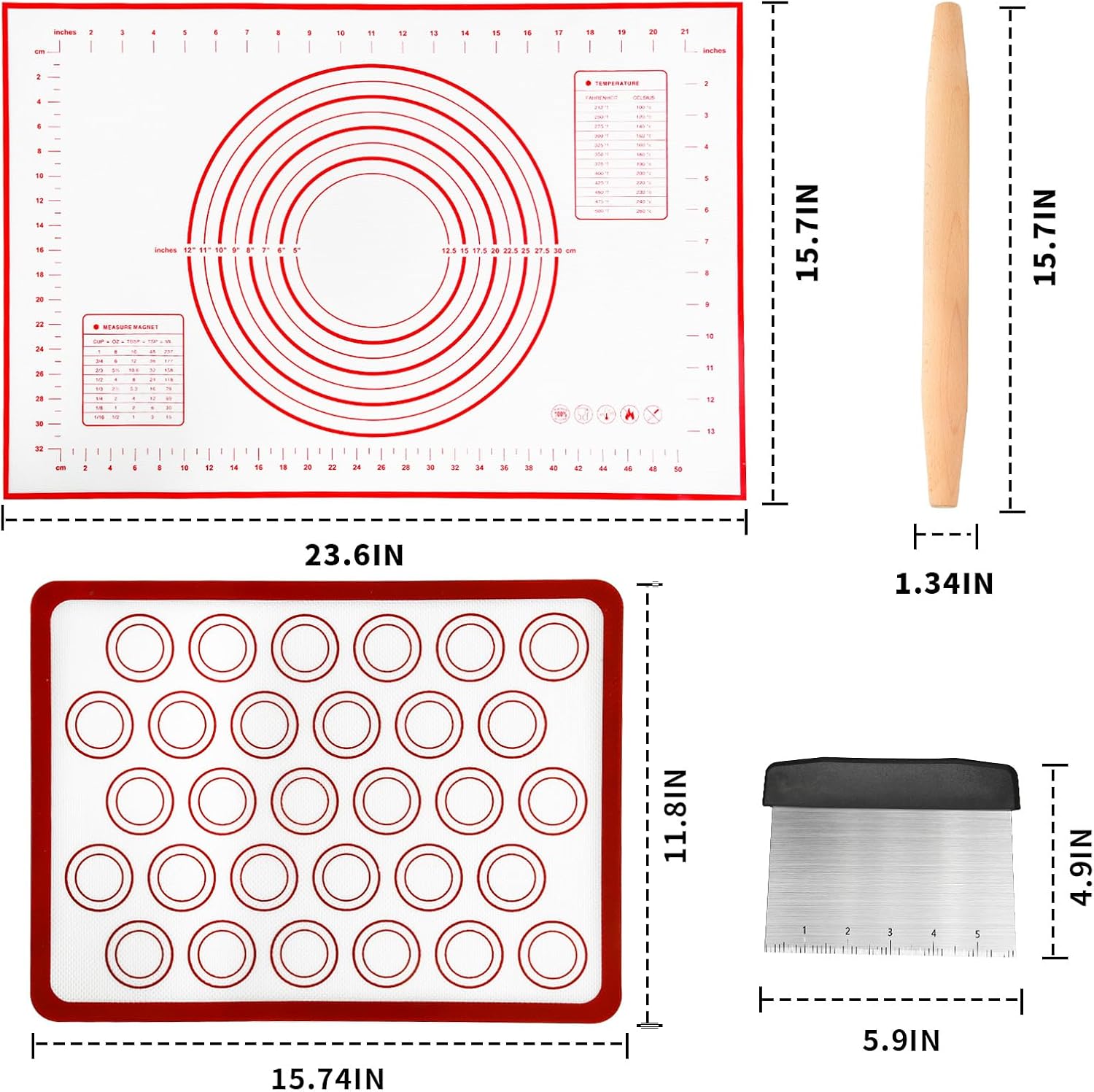 - 🍰【4 IN 1 Baking Tools Set】Silicone Mats for Baking enhance the textural consistency of baked goods by evenly distributing heat across the entire surface of the pan. The Pastry Mat can be used to roll out pie dough. The Wooden Rolling Pin for Baking is used for laminated and yeasted doughs. Macaron Silicone Baking Mats are a perfect solution to help make piping your macarons easier than ever. Dough Pastry Bench Cutter is to scrape congealed bread dough and cut dough.