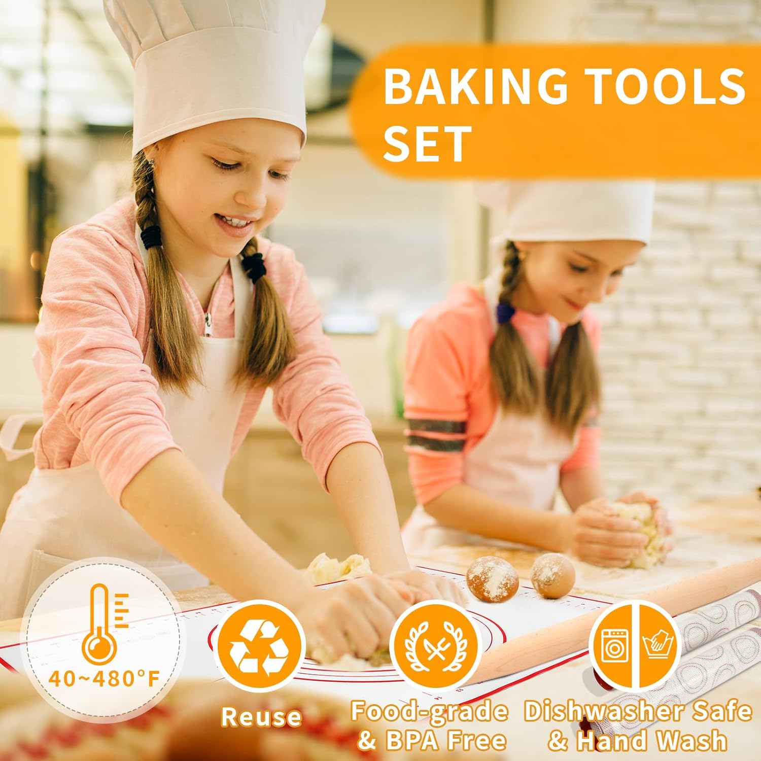 - 🍩【Premium Silicone Baking Mat Sets】Baking silicone mat with rolling pin and dough scraper cutter made of food grade silicone and fiberglass mesh, with double thickness 0.6mm the silicone baking sheets is much durable for long lasting use, which provides good toughness and non-sticky performance, the baking mats silicone for rolling out dough will not easy to deform or wrinkle, easy washing with clean water and dishwasher safe, reusable for frequent use.