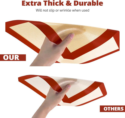 - [DURABLE MATERIAL] Silicone mat for baking are crafted from food-grade silicone to help distribute heat evenly over the entire baking surface. Excellent heat resistance and durability make the silicone baking sheets oven safe from -40°F to 446°F.