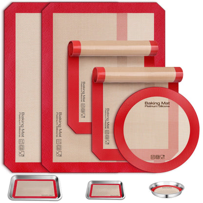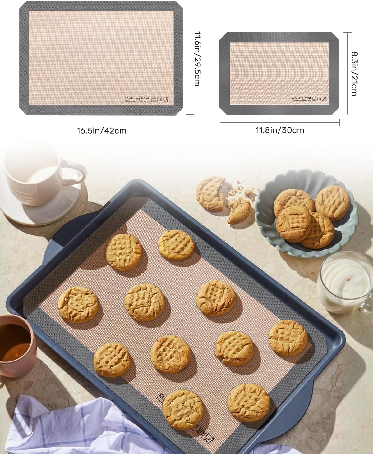 - Great Size Set: Our baking silicone mat includes 2 half-sheet mats (fits standard pans) + 2 quarter-sheets (for cookies/macarons) + 1 round 9" mat (pizza/tarts). Covers 90% of home baking needs