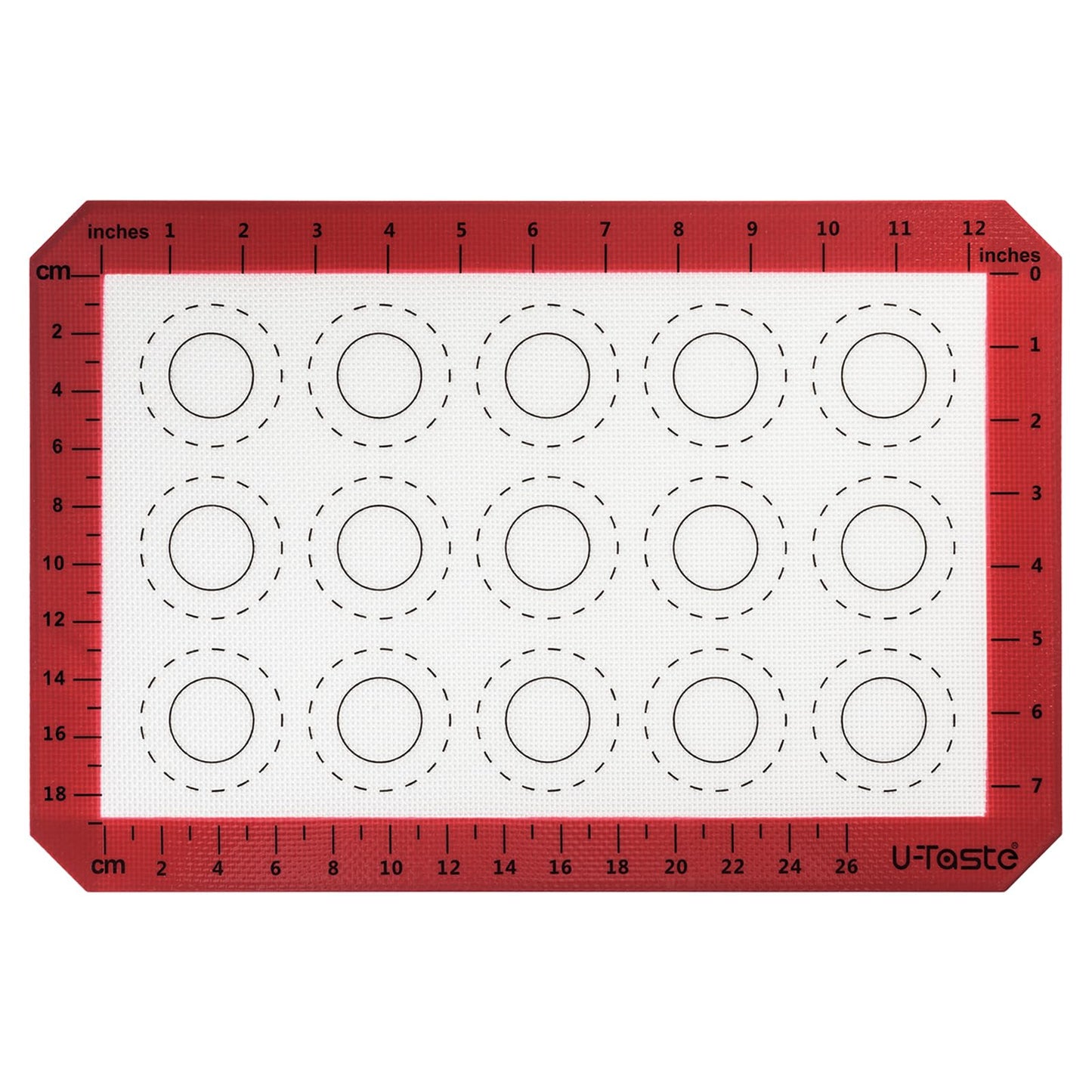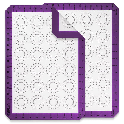 - [Both cm and inch measurement] The large inch and cm measurement markings along edge are clearly defined and well printed (won't fade away) and friendly to older eyes. The circle guides do a really great job of keeping the spacing great and the size just right, idea for baking macarons, meeting 6.77% buyers' needs. Measure your pans before buying. Half Sheets size: 16.50x11.66 inch; Jelly Roll Sheets size: 14.17x9.44 inch; Quarter Sheets size: 11.75x8.25 inch.